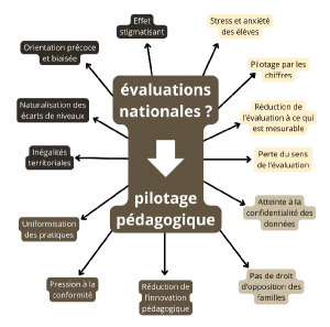 Voyez cette vidéo où l’inspectrice Générale Madame Abraham explique comment les résultats des évaluations nationales doivent être le fil rouge du travail dans les écoles. Lors de formations de directrices et directeurs, on leur demande de mener les réunions de conseil des maître·sses de façon à ce que le bien-fondé des exercices et des conditions de passation des évaluations ne soit pas questionné. Depuis quelque temps, des équipes sont contraintes d’utiliser de façon uniforme et standardisée des séances de classe pour améliorer les résultats d’items chutés. Des formatrices et formateurs académiques conseillent aux enseignant·e·s de maternelle de préparer les évaluations nationales de CP ! Et on pourrait multiplier les exemples.