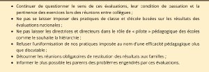 Face aux résistances passées contre la mise en place des évaluations nationales, notre hiérarchie avait jusqu’à maintenant opté pour une stratégie implicite de conciliation : « faites-les passer et après on vous fiche la paix ». Maintenant que le passage des évaluations s’est banalisé et généralisé, une autre phase se met en place : le contrôle de nos pratiques de classe, nos projets d’école en fonction des résultats des évaluations nationales.